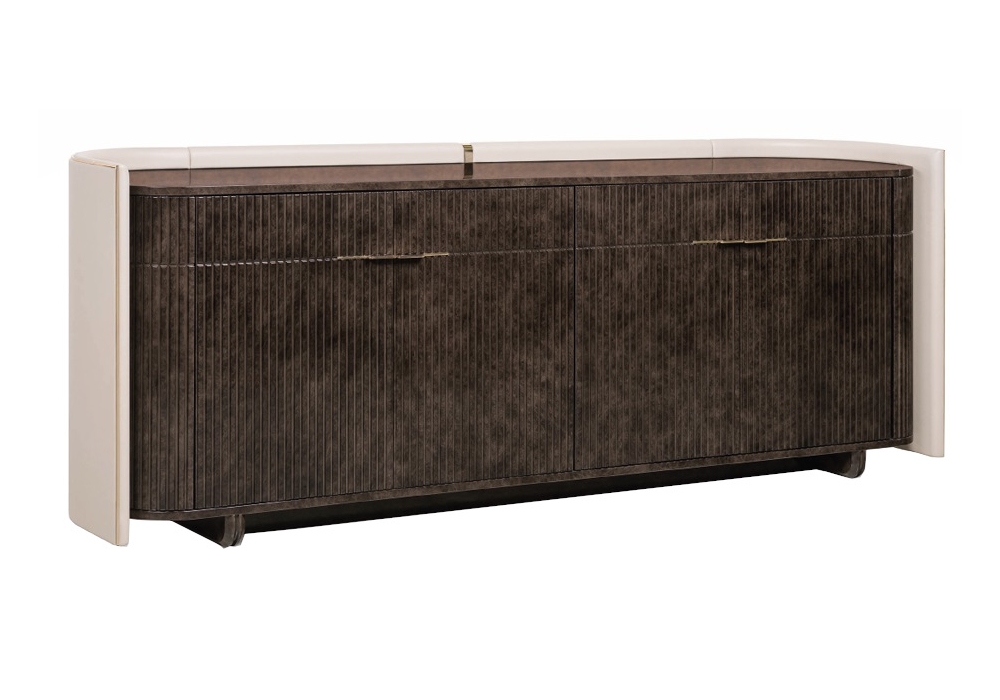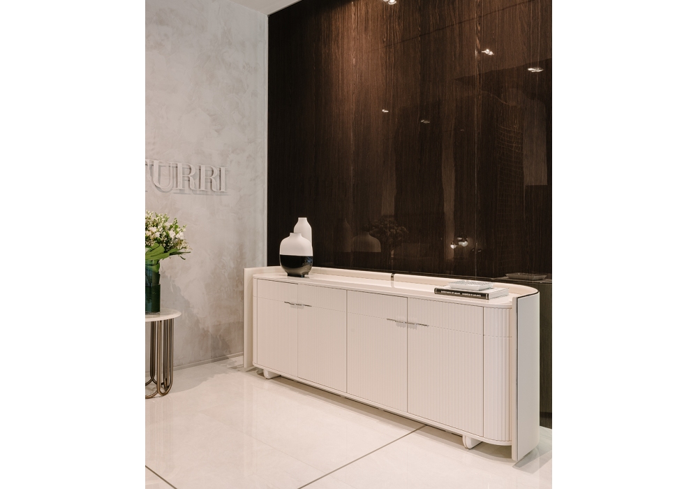 Eclipse von Andrea Bonini für Turri entworfen, ist ein Sideboard mit MDF- und Sperrholzstruktur in glänzend lackierter Ausführung und mit Leder bezogener Schale. Im Inneren befinden sich zwei Fächer mit je einem Glaseinlegeboden. Innenwandverkleidung aus Mikrofaser. Die vier Holztüren haben eine gerippte Holzdekoration.