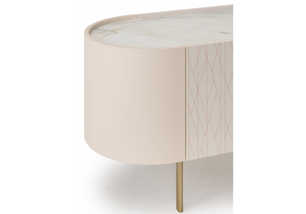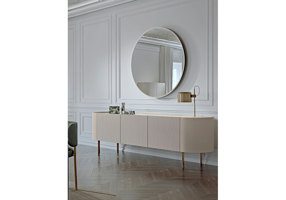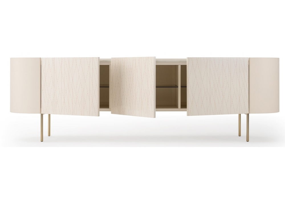 Roma von Monica Armani für Turri entworfen, ist ein Sideboard mit Struktur aus MDF und glänzend lackiertem Sperrholz mit seitlicher Strukturverkleidung aus Leder. Die Platte kann aus Leder oder Marmor gefertigt werden und die Beine sind aus Metall in zwei Ausführungen. Verfügabr in der Version mit Türen mit oder ohne Dekoration. Auf Wunsch Glastüren.