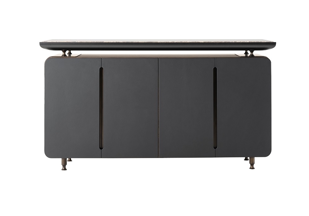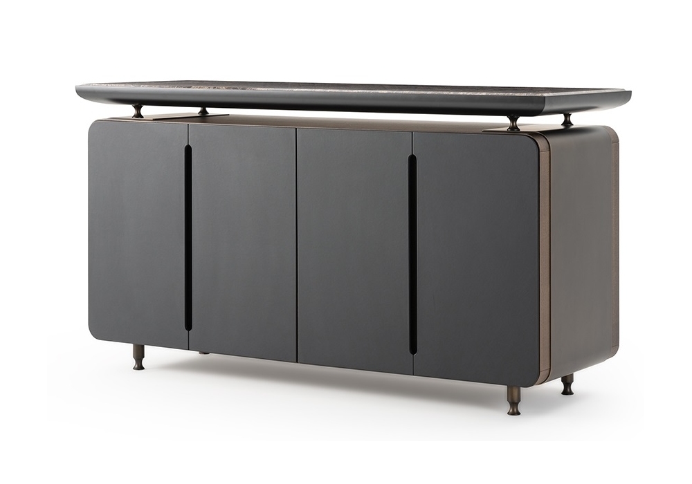 Silhouette von Gensler für Turri entworfen, ist ein Sideboard mit Struktur aus MDF und Spanplatten mit wärmebehandeltem Eukalyptusfurnier und Platte aus Marmor. Es gibt zwei Fächer, die mit einem transparenten Glasboden ausgestattet sind. Flügeltüren aus Holz oder mit Leder bezogen. Füße und Metalldetails in gebürsteter Bronzeausführung.