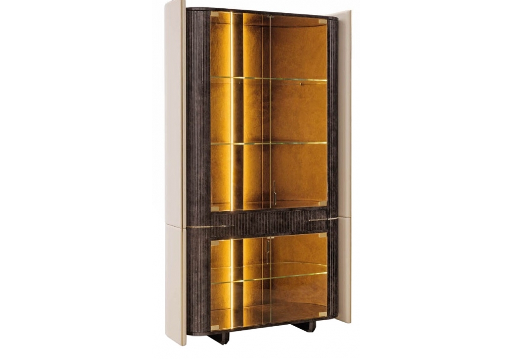 Eclipse diseñada por Andrea Bonini para Turri es una vitrina con estructura en MDF, madera contrachapada y paneles de aglomerado decorados a mano y tapizado en piel. Disponible con 4 puertas de cristal y un cajón o con dos puertas de cristal. También disponible con iluminación LED.