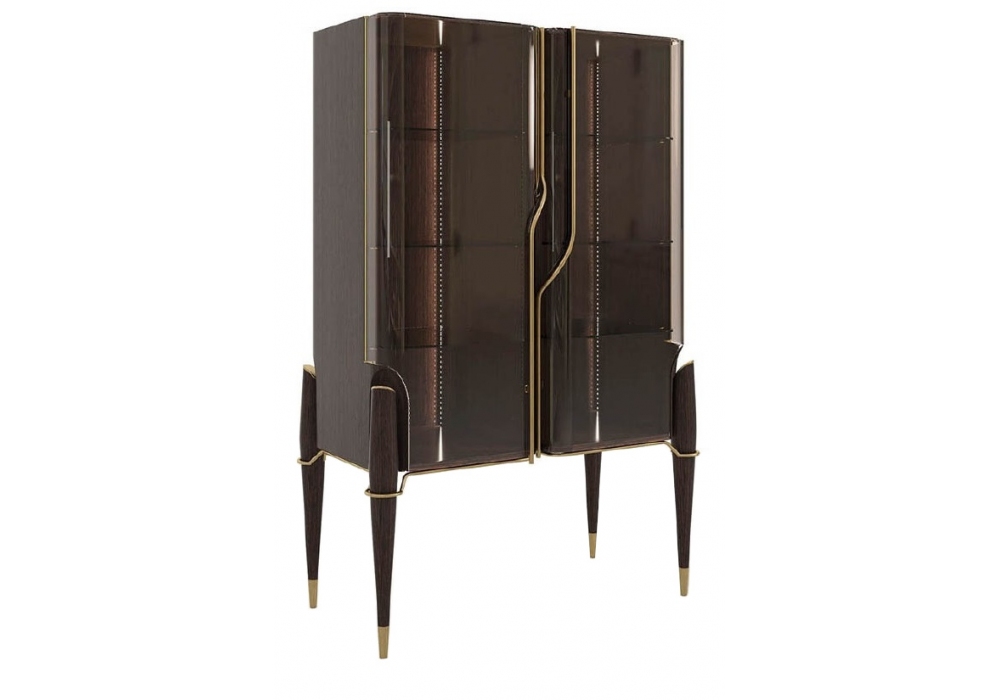 Melting Light von Frank Jiang für Turri entworfen, ist eine Vitrine mit Struktur aus MDF, Sperrholz, Massivholz und Nussbaum furnierten Spanplatten. Türen aus bronziertem Glas und Metallteile in Gold oder gebürsteter Bronze. Im Inneren befinden sich zwei Fächer mit jeweils drei Glaseinlegeböden. LED-Beleuchtung.