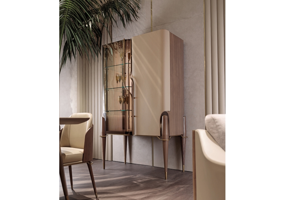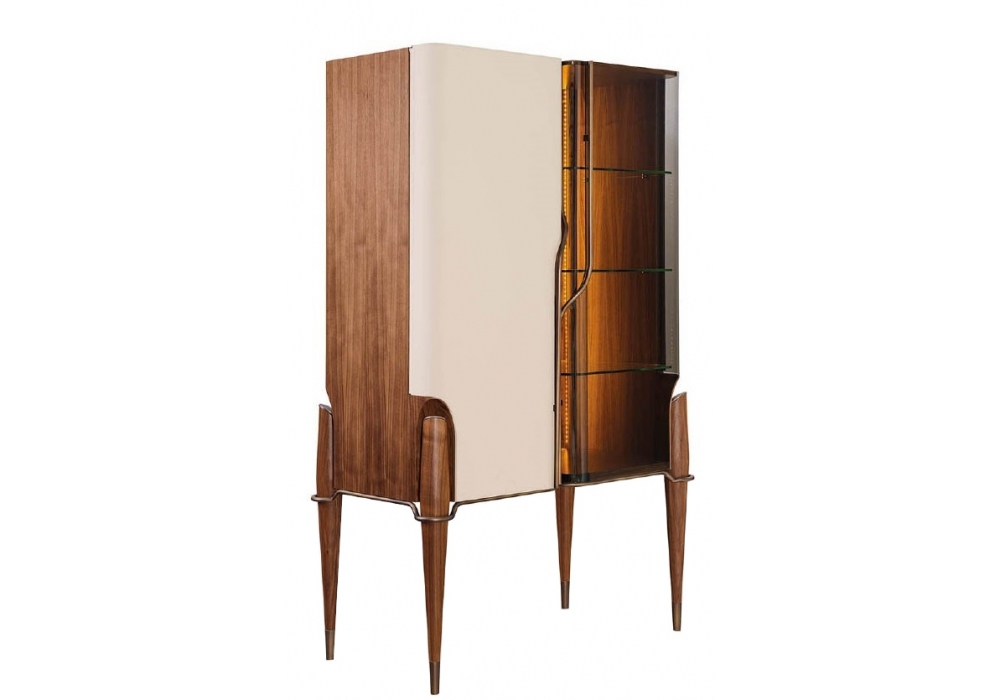 Melting Light Leder, von Frank Jiang für Turri entworfen, ist eine Vitrine mit einer Struktur aus MDF, Sperrholz, Massivholz und nussbaumfurnierten Spanplatten. Eine Tür besteht aus bronziertem Glas, die andere ist mit verschiedenen Ledern bezogen. Im Inneren befinden sich zwei Fächer mit jeweils drei Glaseinlegeböden. LED-Beleuchtung.