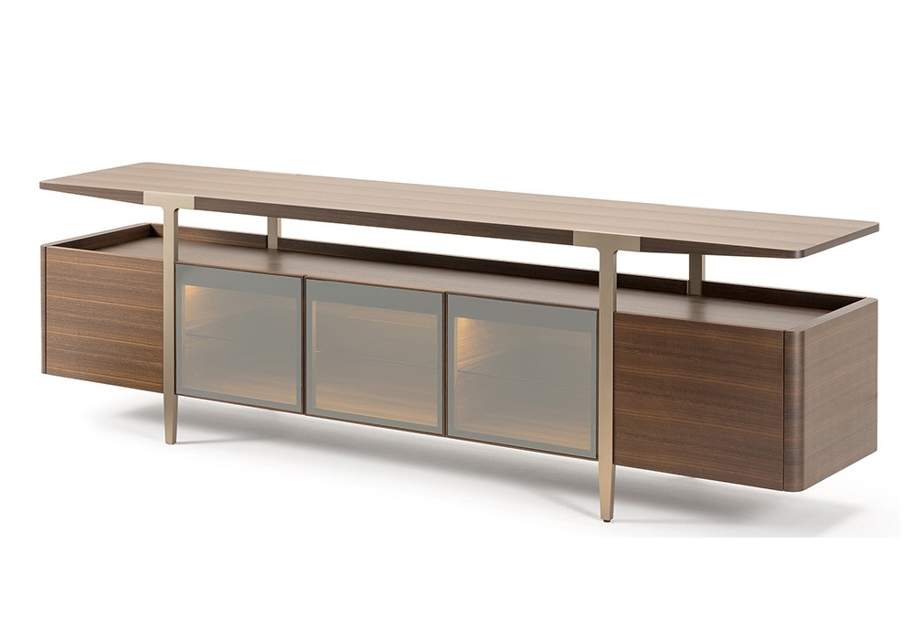 Domus von Matteo Nunziati für Turri entworfen, ist ein Sideboard mit Struktur aus MDF und Spanplatten mit wärmebehandeltem Eukalyptusfurnier. Platte aus mit Marmor oder Eukalyptus furniertem Holz und Metallbeine in mattem hellem Platin-Finish. Die Türen können entweder alle aus furniertem Eukalyptusholz oder drei aus reflektierendem Glas und zwei aus Holz sein. Im Inneren befinden sich drei Fächer mit einem Glasboden. LED-Innenbeleuchtung auf Anfrage.