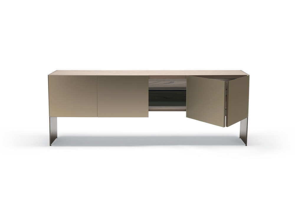Aipim von Arthur Casas für MisuraEmme entworfen, ist ein Sideboard, das sich durch ein faltbares vorderes Öffnungssystem auszeichnet, das eine vollständige Öffnung des Sicherheitsfachs ermöglicht und den Zugang funktional macht. Die Basis besteht aus zwei natürlichen Eisenstützen, die an den Schultern verankert sind. Die allgemeine Struktur in MDF. Das Äußere wird durch die Kombination von säuregeätzten Spiegeln mit Stützen aus geschnittener schwarzer Eiche oder grauer Ulme geschaffen. Interne Struktur in der gleichen Ausführung wie die Platte.