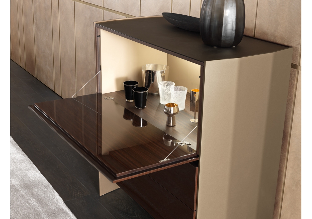 Milvian von Francesco Lucchese für MisuraEmme entworfen, ist ein Sideboard mit Marmor- oder geätzter Glasplatte und lackierten Aluminiumseiten. Erhältlich in zwei Lösungen: hohes Sideboard und niedriges Sideboard. Das hohe Sideboard hat eine Hauptklappenöffnung für die Barnutzung. Das niedrige Sideboard ist mit zwei Türen mit Klappöffnung ausgestattet. Innenfach in Hochglanzlackierung und komplett verdecktem Öffnungsmechanismus. Fronten in matt oder glänzend essence.
