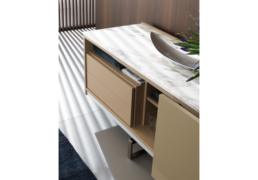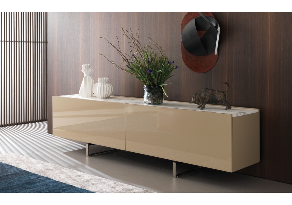 Square von MisuraEmme entworfen, ist eine Kollektion von Sideboards mit festem Grundriss, die mit verstellbaren Füßen oder mit Metallfuß und in zwei Längen erhältlich sind und mit Flügeltüren, Schubladen, Klapptüren und offenen Fächern ausgestattet werden können. Möglichkeit, einen Spalt zwischen der Rückwand und der Wand zu haben, der für den Durchgang von TV-Kabeln genutzt werden kann. Oberflächen der äußeren Struktur: matt lackiert, glänzend lackiert, Holz; Innenaufbau: Ambiente Melamin, Mattlack, Holz; Türen, Schubladen und Klappenausführungen: matt, glänzend lackiert oder Essence und Platte aus Holz, Marmor, lackiertem geätztem Glas oder lackiertem Glas.