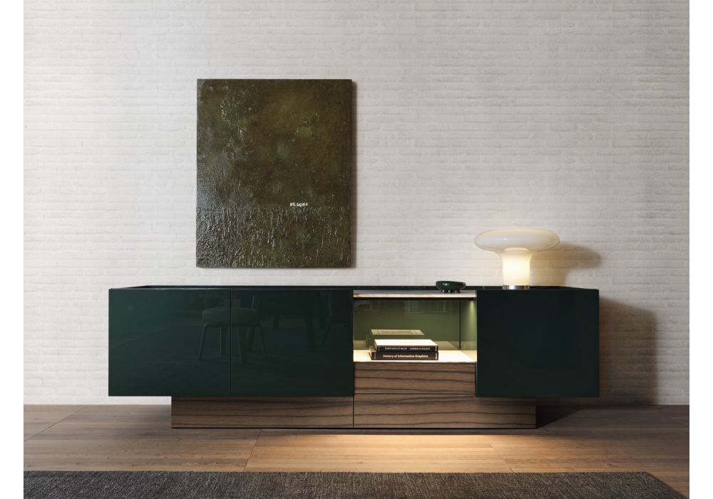 Archway von Rodolfo Dordoni für Molteni&C entworfen, ist ein Sideboard in den glänzend lackierten Farbtönen, die im Katalog erhältlich sind, einschließlich des neuen Piniengrüns und Mandelweiß, die unendliche Anpassungsmöglichkeiten ermöglichen, um es leicht mit jedem Interieur zu kombinieren. Die Platte ist im Gegensatz zur Struktur in Holz oder Marmor erhältlich. Zu den Essenzen gehören die Limba mit ihren goldenen Tönen oder die Kaffeeeiche mit intensiven Schlieren. Das Marmorangebot reicht von Calacatta bis Sahara Noir in der matten oder glänzenden Polyesterversion und bietet eine große Auswahl an Optionen zur individuellen Gestaltung der Ästhetik.
