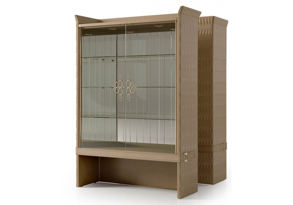 Numero Tre von Roberto Serio für Turri entworfen, ist eine Vitrine mit Struktur aus MDF, Massivholz, mehrschichtigen und Spanplatten in glänzend lackierter Ausführung mit vollständig oder teilweise mit besticktem Leder bezogener Rückseite. Im Inneren befindet sich ein Fach mit bronzierten Spiegelwänden mit drei Glasböden. Verfügbar in mehreren Abmessungen.