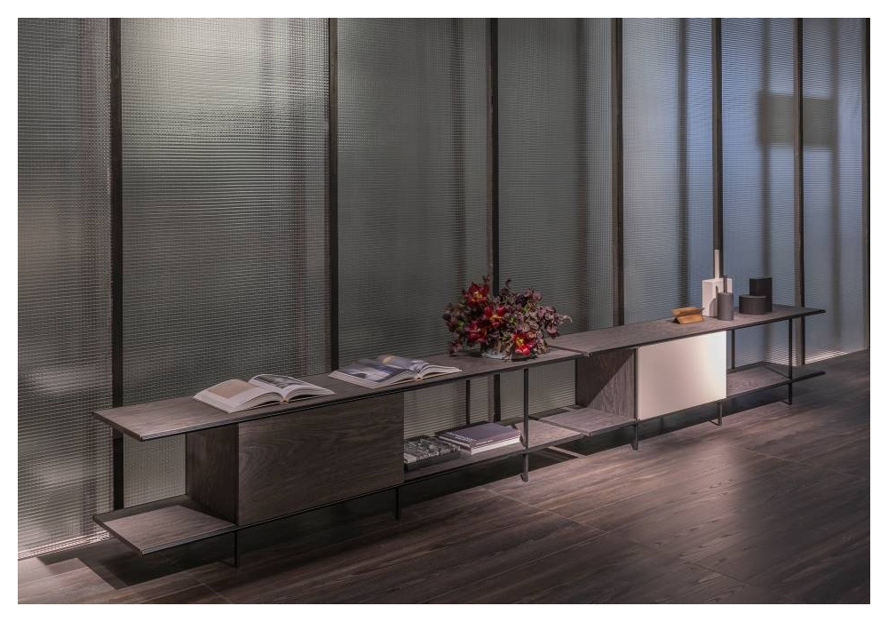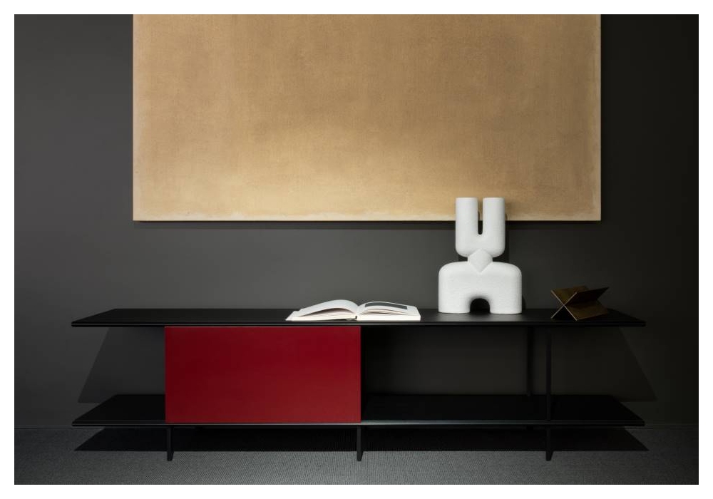 Railway von Giacomo Moor für Living Divani entworfen, ist ein Kommode mit Kufen und Beinen aus schwarz anodisch lackiertem Stahl, Wabenregalen mit Rahmen aus massiver Tanne und Wabeninnenseite sowie Schultern und Rückseite aus Tischlerplatte. Außentüren aus furniertem oder glänzend lackiertem Holz. Verfügbar in zwei Dimensionen.