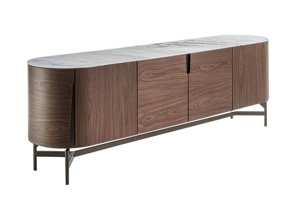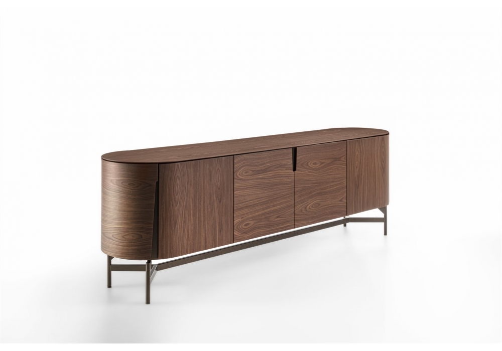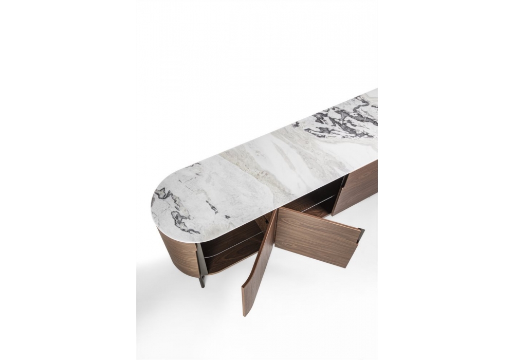 Tylsa 240 von D. Radice für Porada entworfen, ist ein Sideboard mit drei Fächern und vier Flügeltüren mit Struktur aus Esche oder Canaletta-Walnuss. Einbaugriffe mit Metallsockel im Bronzoro-Finish. Metallsockel im Bronzoro-Finish und Tischplatte aus Holz oder Marmor. Innenregale aus transparentem Glas.