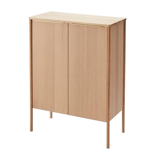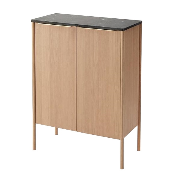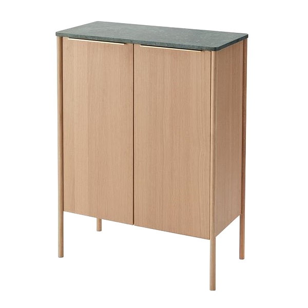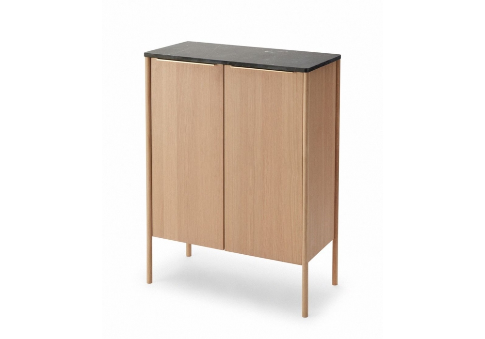 Jut High von Thomas Jenkins für Skagerak entworfen, ist ein Aufbewahrungsmöbel aus Eiche und Details aus Messing. Platte aus Eiche oder Marmor. Erhältlich in verschiedenen Ausführungen.