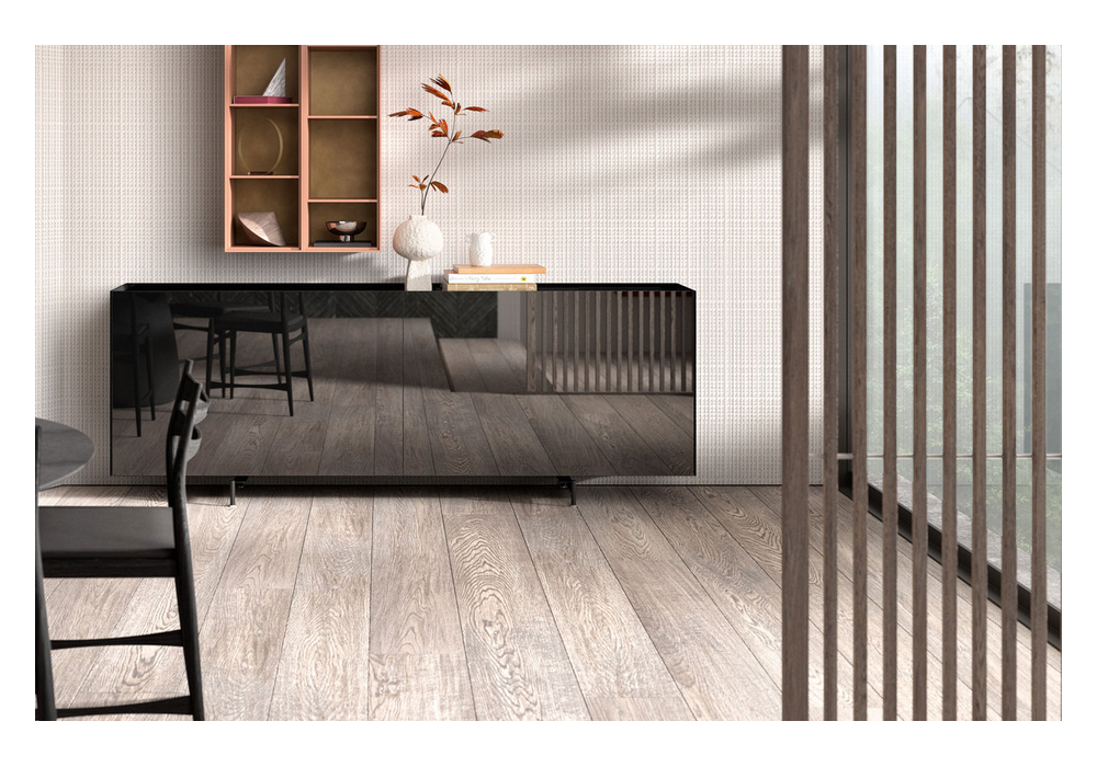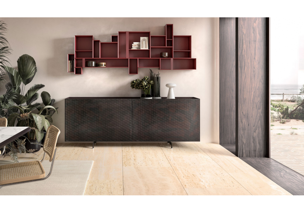 Atelier von Alessio Bassan für Capodopera entworfen, ist ein Sideboard mit Struktur aus glänzend oder matt lackiertem MDF oder mit furnierten Holzplatten. Die Tischplatte kann aus Steinzeug, furniertem Holz oder glänzend lackiert sein.