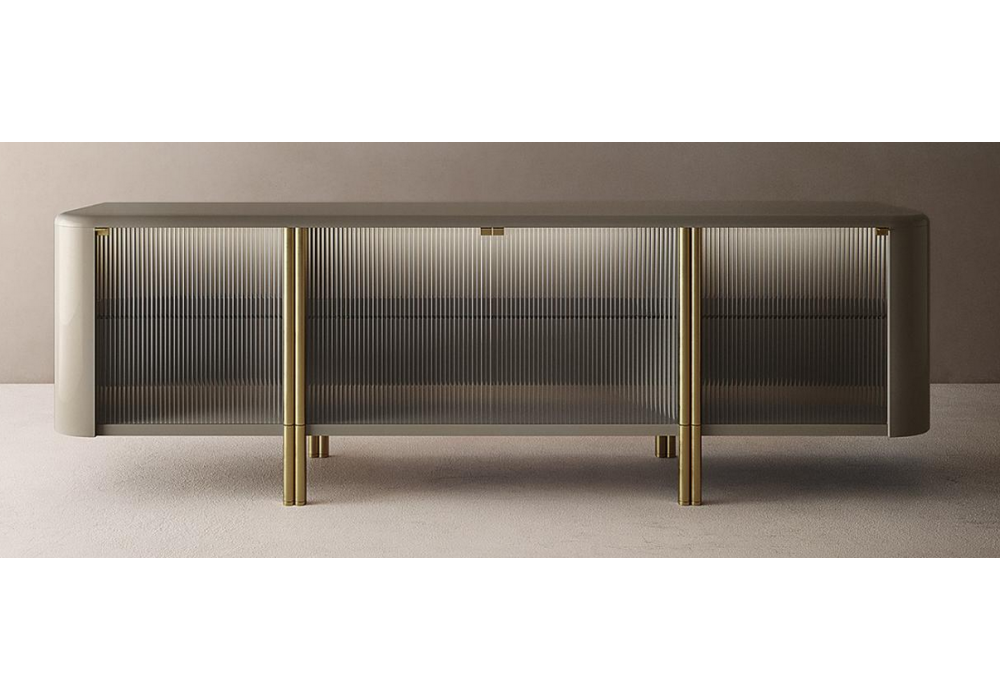 Tecla von Marco Boga für Casamilano entworfen, ist ein Sideboard mit einer Struktur aus MDF und Pappelsperrholz in glänzender, matt lackierter oder furnierter Ausführung. Metallstruktur aus mattem Messing mit Stiftscharnieren. Die Regale sind aus gehärtetem, extraklarem Glas. Es ist mit einer internen Warmlicht-LED-Beleuchtung ausgestattet.