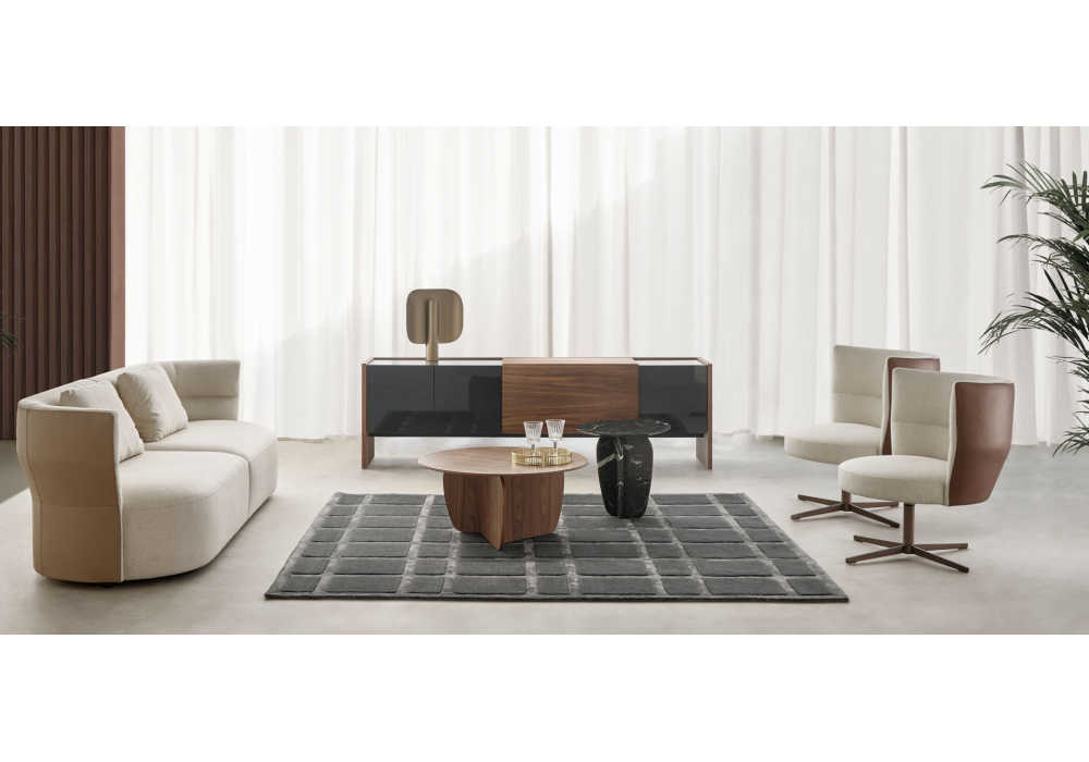 Toscana Lucca von Rodolfo Dordoni für Punt entworfen, ist ein Sideboard mit einer Struktur aus walnussfurniertem MDF und Fronten aus glänzend lackiertem MDF. Das zentrale Modul verfügt über ein Innenregal aus geripptem gehärtetem Glas. Vordere Abdeckung und Beine aus verchromtem Stahl. Flügeltüren ohne Griffe mit 90°-Öffnung. Internes LED-System, das das Ein- und Ausschalten beim Öffnen und Schließen der Türen ermöglicht. Oberes LED-System, aktiviert durch die Bewegung des Fußes unter der Seite. Transformator und LED-Streifen 12V/40W