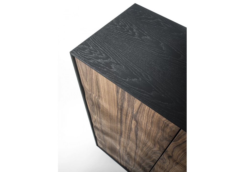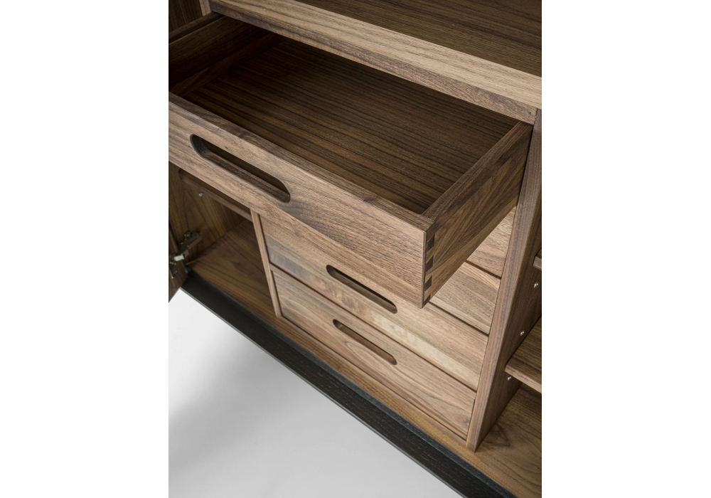 Move High von Authentic Design für Riva 1920 entworfen, ist ein hohes Sideboard aus Massivholz und Blockplatte, das von einem Holzrahmen umschlossen wird. Im Inneren befinden sich Regale und Schubladen, die mit traditionellen Schwalbenschwanzverbindungen und gefrästen Griffen zusammengefügt sind. Die besondere Verarbeitung der Türen erzeugt durch die Extrusion des Holzes einen skulpturalen Effekt und verleiht ihm eine gewundene Bewegung.