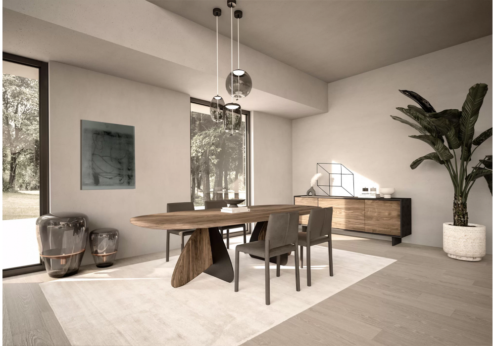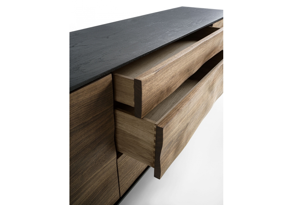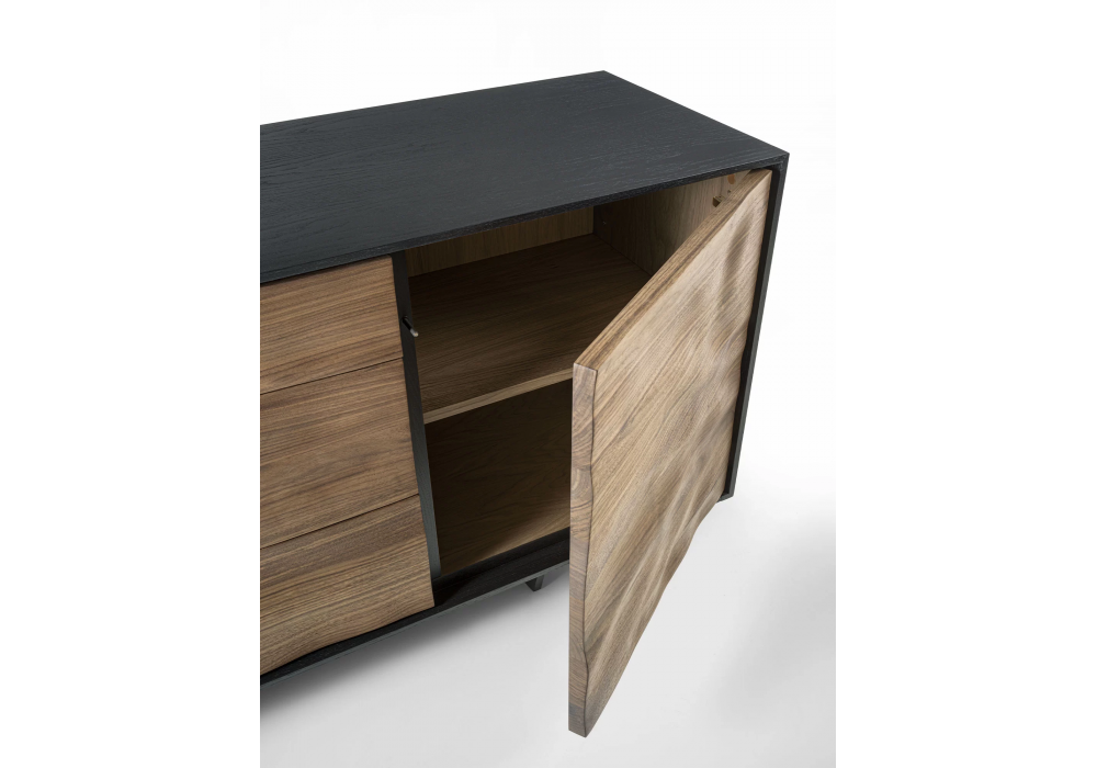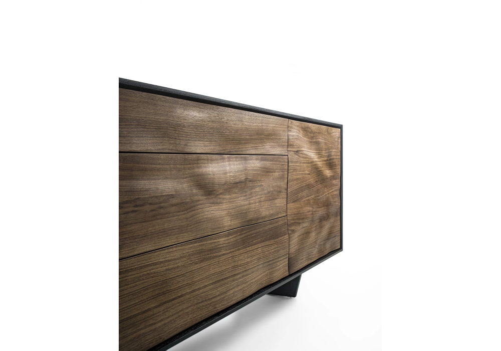 Move Low von Authentic Design für Riva 1920 entworfen, ist ein niedriges Sideboard aus Massivholz und Blockplatte, das von einem Holzrahmen umschlossen wird. Die besondere Verarbeitung der Türen und Schubladenfronten erzeugt durch die Extrusion des Holzes einen skulpturalen Effekt und verleiht ihm eine gewundene Bewegung.
