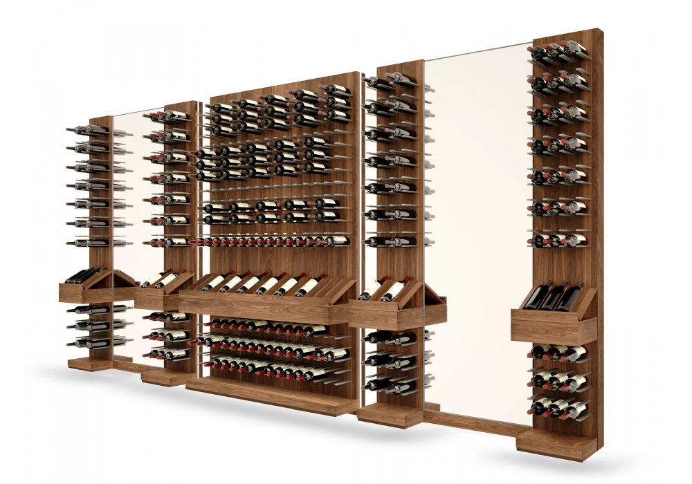 Wine Wally von Arkhé Milano für Riva 1920 entworfen, ist ein modulares offenes System, das sich für die Präsentation von Weinsammlungen eignet. Es besteht aus Boiserie-Paneelen aus furniertem Blockboard mit Massivholzstützen, die die Unterbringung von Flaschen in Standardgröße ermöglichen, abwechselnd mit vertikalen Modulen aus profiliertem Spiegel aus Metall mit Irondust-Finish. Spezielle geneigte Displays aus Massivholz ermöglichen die Aufwertung der Flaschen. Der untere Teil bietet mehr Platz für Flaschen im Großformat. Möglichkeit zur Hintergrundbeleuchtung der Paneele mit LED-Profilen.