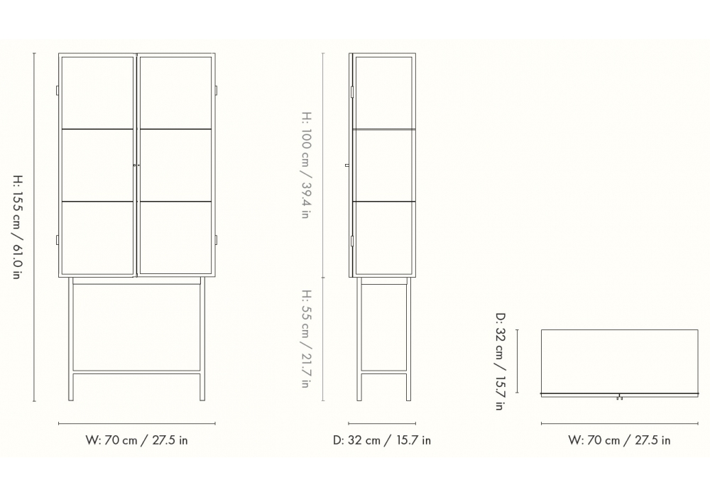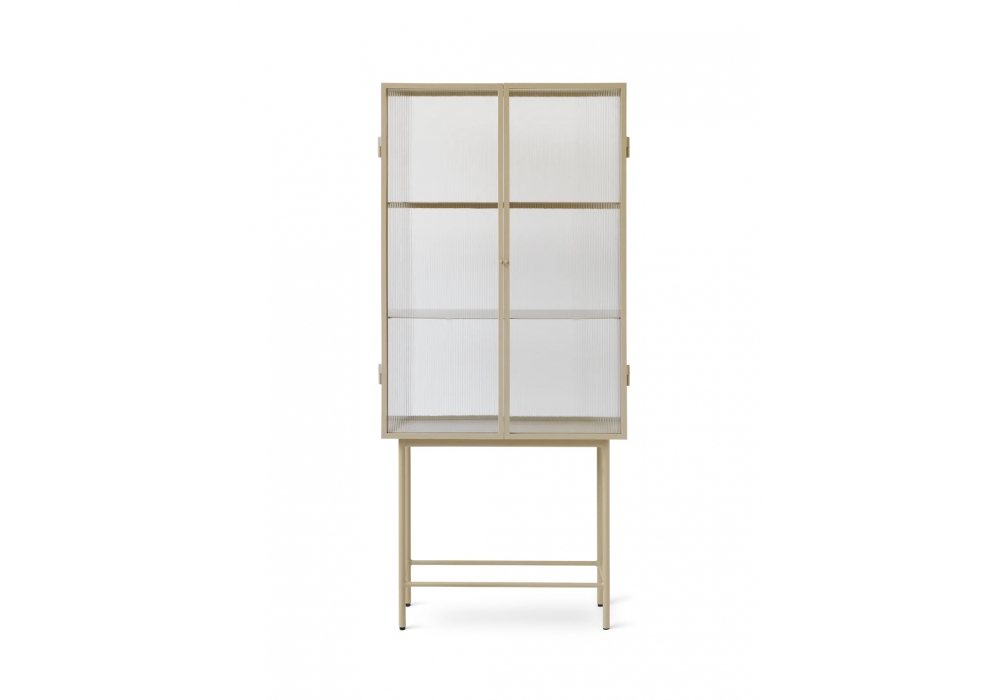 Haze von Ferm Living entworfen, ist eine Vitrine mit geriffelten Glastüren und pulverbeschichteter Stahlkonstruktion, verfügbar in verschiedenen Ausführungen. Inklusive zwei Metallregalen, Wandhalterungen und verstellbaren Füßen. Die Glastüren schließen dank Magneten nahtlos und öffnen sich, um zwei pulverbeschichtete Metallregale freizugeben. Verwenden Sie die Vitrine zur stilvollen Aufbewahrung von Kosmetikutensilien oder als modernen Blickfang in Ihrem Esszimmer zur Aufbewahrung von Geschirr und mehr