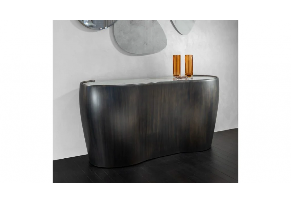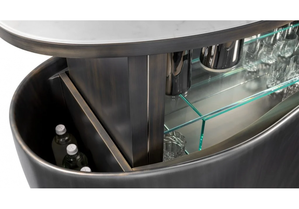 Coco De Mer von Riccardo Lucatello für Reflex Angelo entworfen, ist ein geformtes Bahut/Barmöbel in matt lackierter Ausführung oder in satiniertem Messing oder Titan. Platte in Marmoreflex/Legnoreflex. Elektrisches Hebesystem mit Fernbedienung zum Herausziehen der internen Aufbewahrungseinheit mit Glasregalen und Flaschenhaltern.