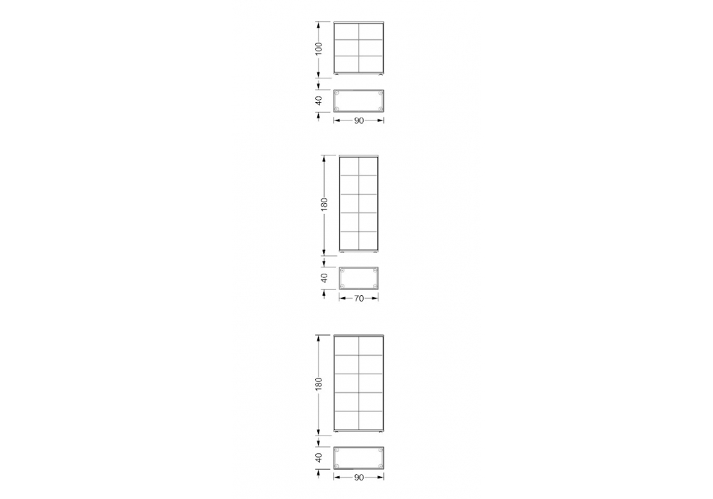 | Abmessungen | 90 x 40 x H 100 cm; 70 x 40 x H 180 cm; 90 x 40 x H 180 cm. |