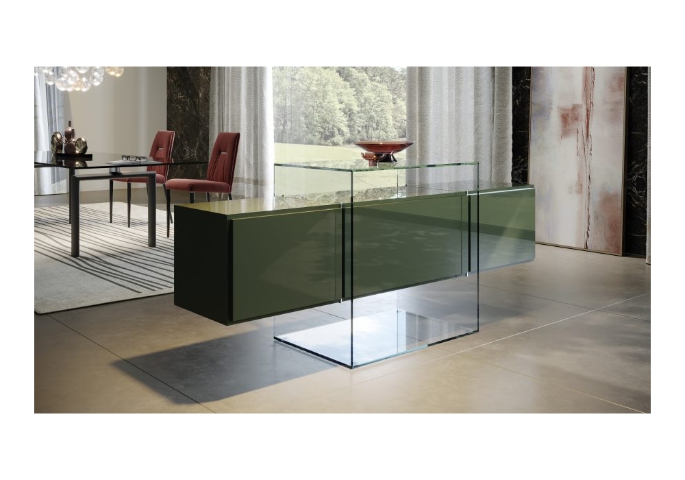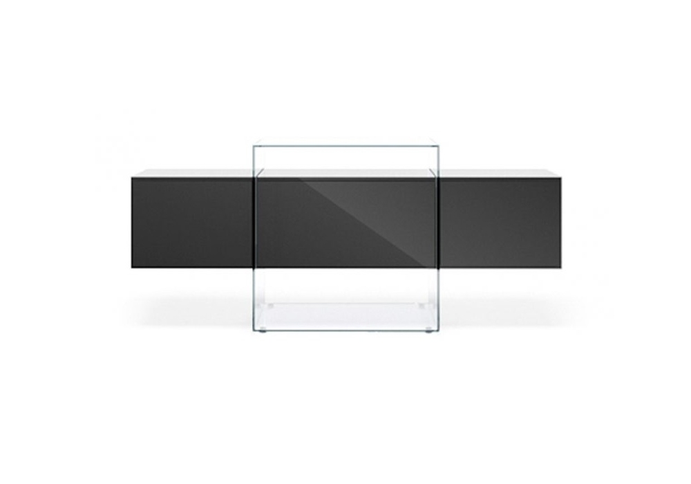 Kubo von Riccardo Lucatello für Reflex Angelo entworfen, ist ein Sideboard aus Holz mit 4 Flügeltüren mit Innenteiler und 1 Klapptür, verfügbar in Canaletto-Nussbaum, glänzendem Ebenholz oder glänzendem oder mattem Lack. Zentrale Stütze aus extraklarem Glas.