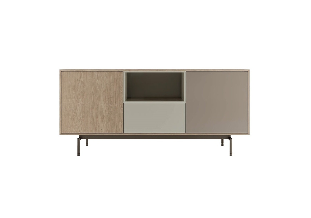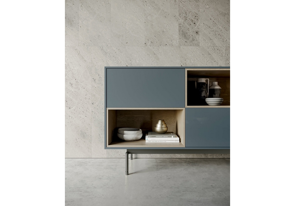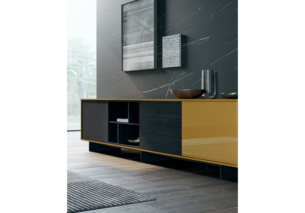 Code von Dall'Agnese entworfen, ist ein Sideboard aus Spanplatten. Die Außenseite und die offenen Fächer sind mit Holzfurnier, strukturiert oder matt, glänzend lackiert oder in Hochglanzoptik versehen. Die Innenseite und die Struktur der Elemente mit Türen oder Schubladen sind in strukturiertem Havanna, auf Wunsch auch in matt lackiert erhältlich. Push-Pull-Öffnung für die Fronten. Verfügbar mit Lama- und Tube-Basis oder mit Füßen. Möglichkeit der Abschlussplatte für die Rückseite, geeignet für die Platzierung in der Raummitte.