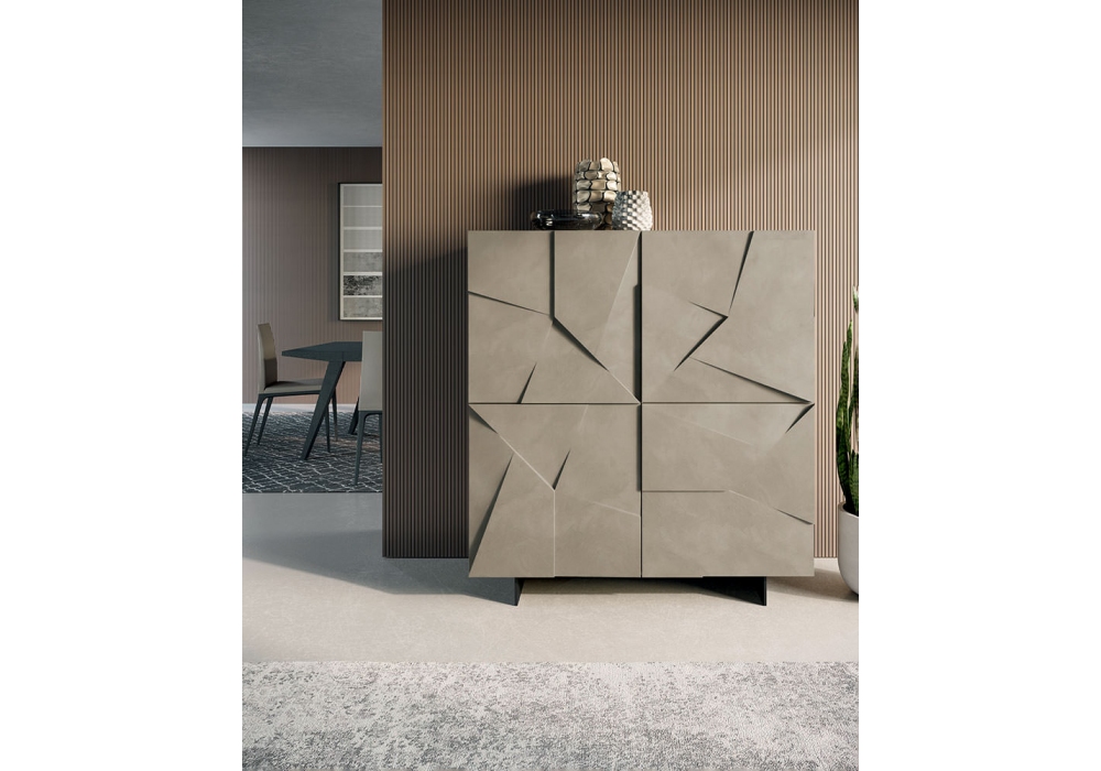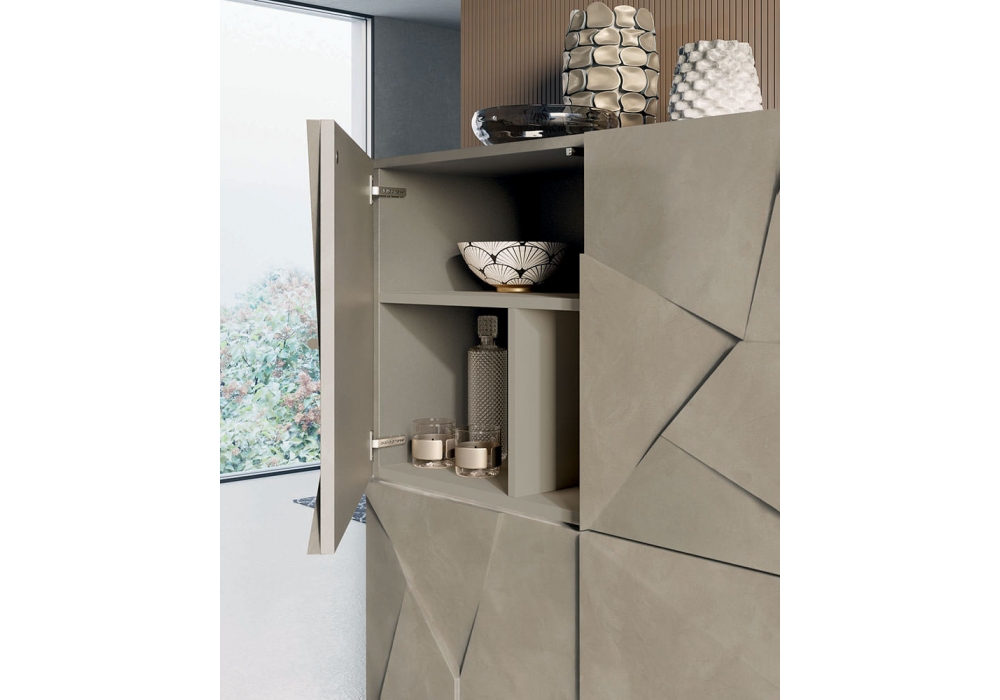 Concrete von Dall'Agnese entworfen, ist ein Sideboard aus Spanplatte. Die Außenseite ist in matt lackierter oder glänzender Oberfläche erhältlich, während die Innenseite in strukturiertem Havanna gehalten ist, auf Anfrage ist auch eine matte Lackierung möglich. Außenstruktur und Innenfach aus Holz. Die Fronten haben pantografierte und facettierte Türen, die nur per Push-and-Pull geöffnet werden können. Verfügbar mit Lama- und Tube-Basis oder mit Füßen.