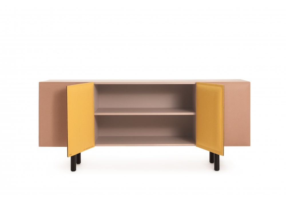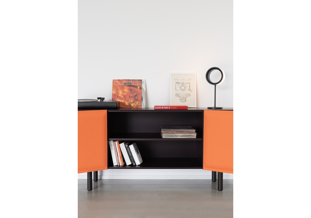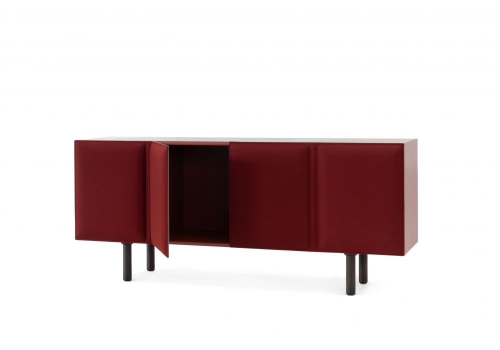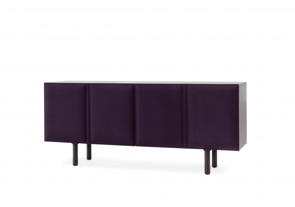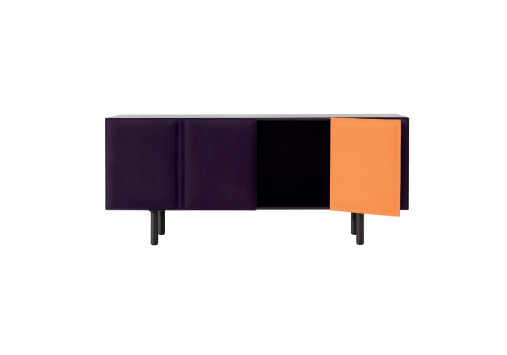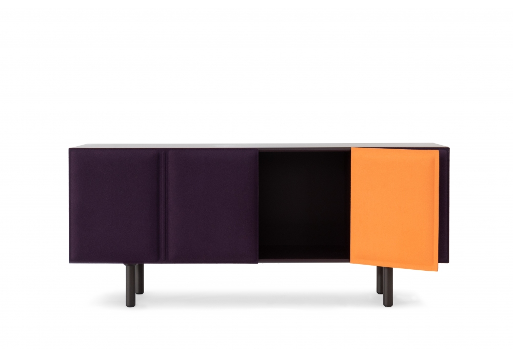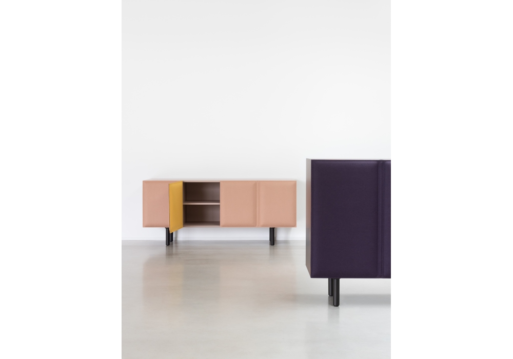 Tacito von Alessandro Stabile für Magis entworfen, ist ein hohes Lagereinheit mit einer Struktur (Seiten, Rückseite und Regale) aus lackiertem MDF, Filztüren und Beinen aus eloxiertem Aluminium in dunkelbraunem Finish.