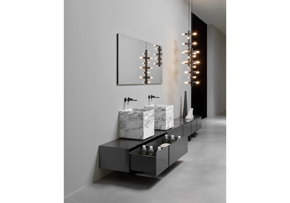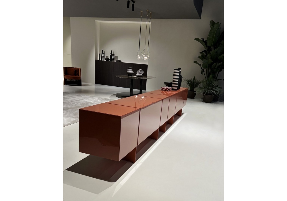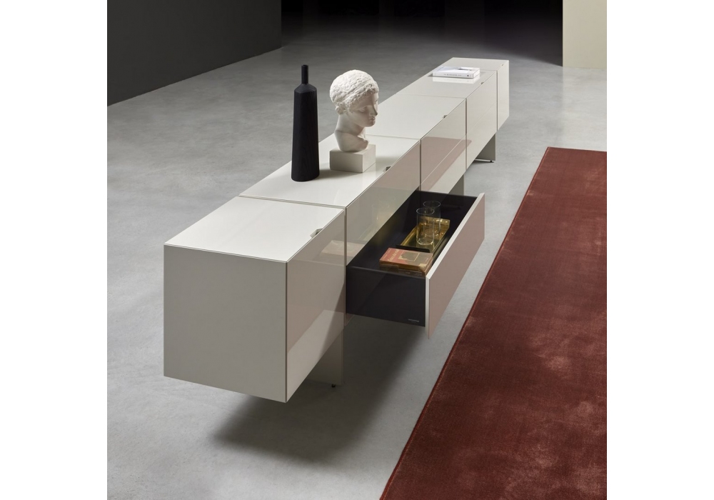 Fox von Carlo Colombo für Antonio Lupi entworfen, ist ein Sideboard-System, das sich durch klare Linien und eine elegante Abfolge paralleler Regale auszeichnet. Die Seitenteile, wahre Strukturelemente, tragen die Aufbewahrungsmodule und schaffen so ein Gleichgewicht zwischen Strenge und Leichtigkeit. Erhältlich in verschiedenen Konfigurationen und Öffnungsarten, besticht Fox durch präzise Volumen und raffinierte Details, wie den sichtbaren gefrästen Griff. In der freistehenden Version ist das Sideboard von beiden Seiten zugänglich und wird so zu einem starken architektonischen Element, das durch die glänzend lackierten Oberflächen noch verstärkt wird.
