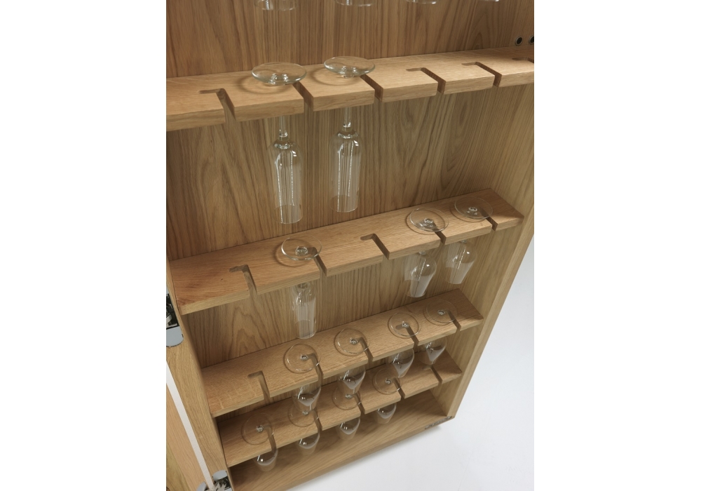 Cambusa Wine Jumbo von Giuliano Cappelletti für Riva 1920 entworfen, ist ein multifunktionaler Kommode aus Tischlerplatte und Massivholz mit Doppeltür mit 180 ° Öffnungswinkel. Die Innenaufteilung umfasst Ablagefächer für Flaschen und Gläser mit der Möglichkeit, Kleingeräte einzusetzen. Das Innere des Schranks wird durch LED-Streifen beleuchtet, die auf der mittleren Schulter positioniert sind und deren Zündung automatisch durch Sensoren erfolgt, die beim Öffnen der Türen aktiviert werden.