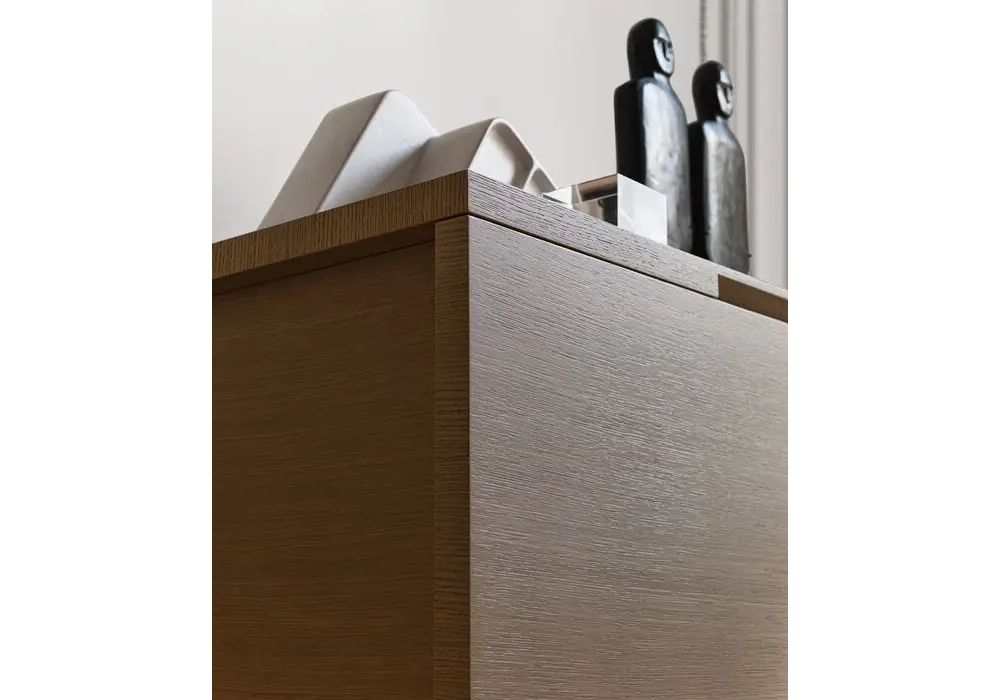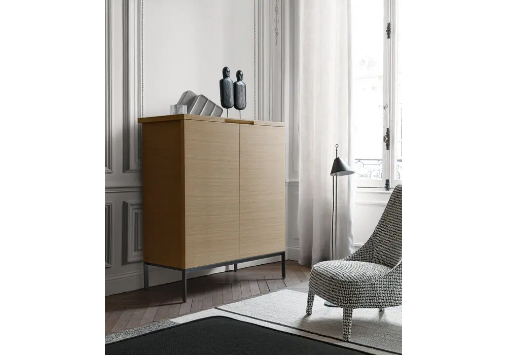 Mida von Antonio Citterio für Maxalto entworfen, ist ein Aufbewahrungsmöbel mit zwei Flügeltüren. Basis aus poliertem verchromtem Stahl, bronzefarben lackiertem Nickel oder schwarz lackiert. Struktur aus grauer Eiche, gebürsteter heller Eiche, gebürsteter schwarzer Eiche oder natürlichem Wenge. Die Innenräume der Behälter sind aus Holz oder glänzend ziegelrot lackiert. Die Türen haben eine 270°-Öffnung.