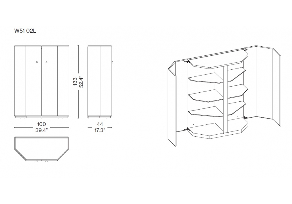 Bramante 2 von Kazuhide Takahama für Cassina entworfen, ist ein Möbel mit Türen aus MDF-Holzfaserplatten. Die Schubladen haben Fronten aus furnierter Spanplatte. Seiten, Bodenrückwand und Einlegeböden bestehen aus furnierter Spanplatte mit Eschenkanten. Das Schloss ist in Messing oder Aluminium erhältlich, die Scharniere sind aus verchromtem Stahl und die Griffe aus gedrehtem Metall.