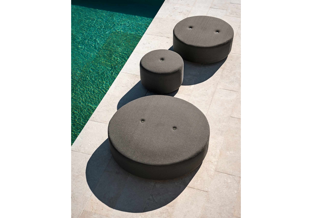 Double, von Rodolfo Dordoni für Roda entworfen, ist einer Pouf mit Grundelement aus Nylon, Innenleben in gummierten Kunststoff mit offenen Zellen und Polsterung aus Hydro Draining Polyuretan Schäumung mit offenen Zellen und mit 3D- Netz 100% Polyester bezogen. Verfügbar in drei Ausführungen und drei Größen.