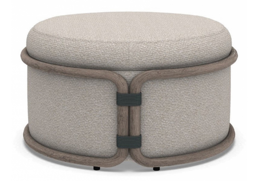 Rotin von Zanellato/Bortotto für Ethimo entworfen, ist ein runder Hocker mit Gestell aus gebeiztem Teakholz und Stoffbezug, verfügbar in verschiedenen Ausführungen.