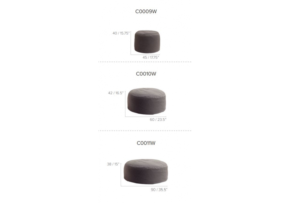 | Abmessungen | Ø 45 x H 40 cm; Ø 60 x H 42 cm; Ø 90 x H 38 cm. |