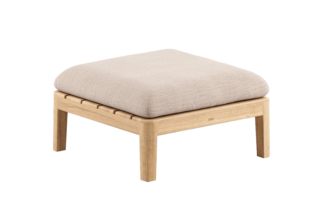 Calypso Lounge, von Kris Van Puyvelde für Royal Botania entworfen, ist ein Outdoor-Fußhocker mit Teakholzstruktur und Polsterung in verschiedenen Ausführungen. Erhältlich in zwei Größen.