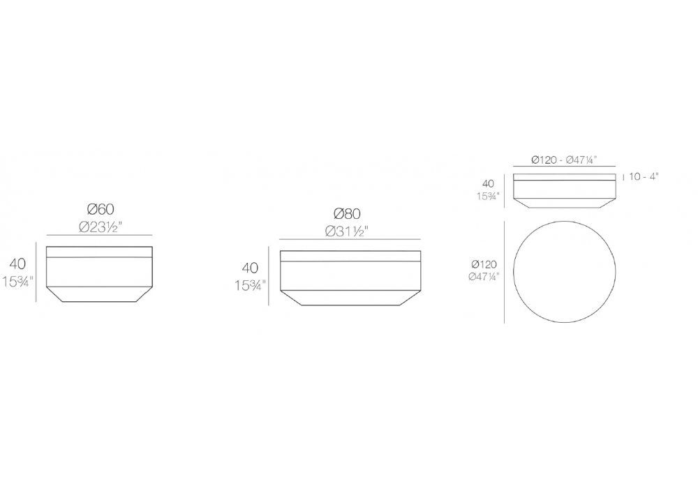 | Abmessungen | Ø 60 x H 40 cm; Ø 80 x H 80 cm; Ø 120 x H 120 cm. |