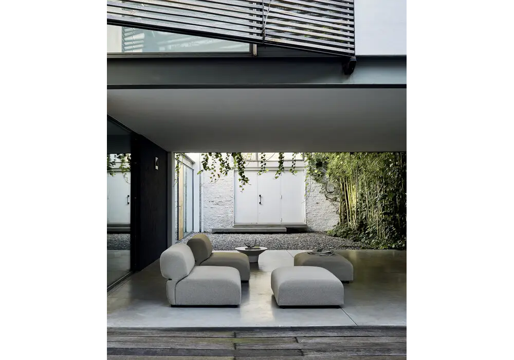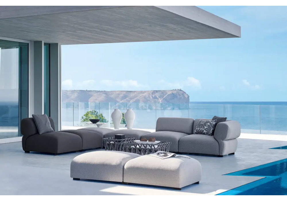 Butterfly von Patricia Urquiola für B&B Italia Outdoor entworfen, ist ein Sitzpouf mit Innenrahmen aus Stahlrohr und Stahlprofilen und Polsterung aus flexiblem Kaltschaum Bayfit® aus Polyurethan, Futter aus Polyesterfaser mit wasserabweisender Behandlung, mit heißversiegelten Nähten. Stoffpolsterung in verschiedenen Ausführungen.