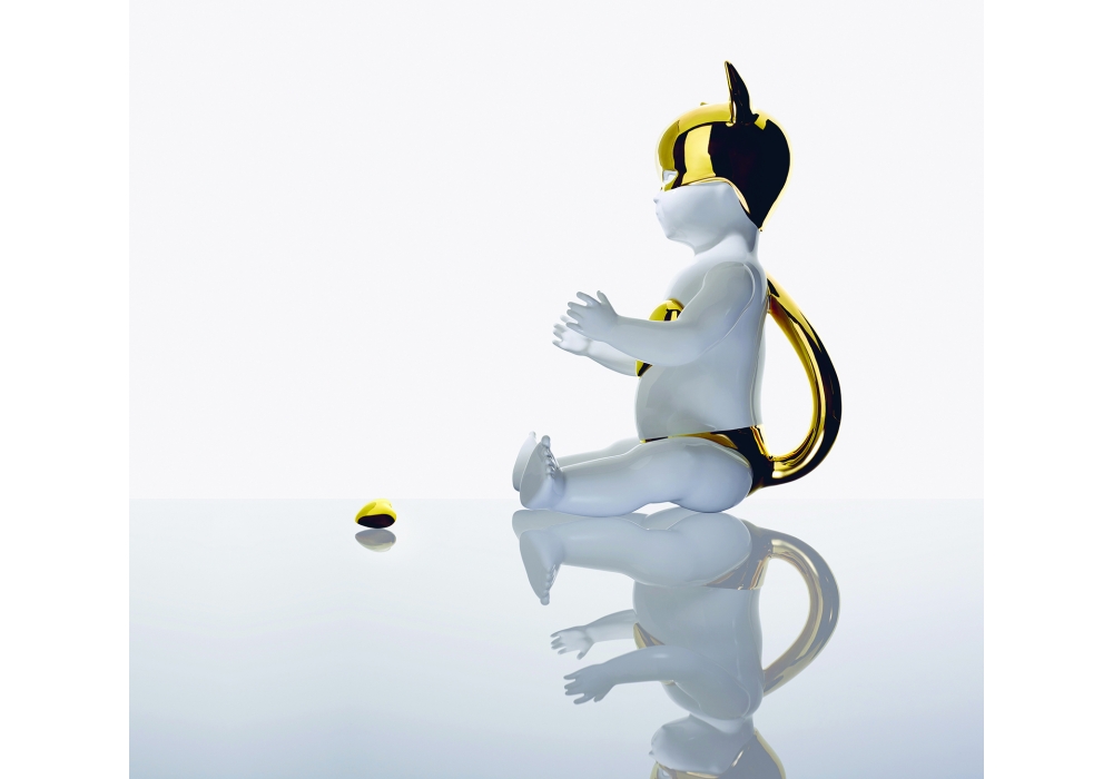 Oh, baby, it is a wild world, von Nika Zupanc für Bosa entworfen, ist eine Skulptur in weißer Keramik mit Details in glänzendem Gold, die den klassischen Puppenformen ähnelt, mit einem unerwarteten Design und bietet Emotionen mit Nostalgie. Es ist ein emotionaler Container, der Hüter der Dinge, die Wertvollste.
