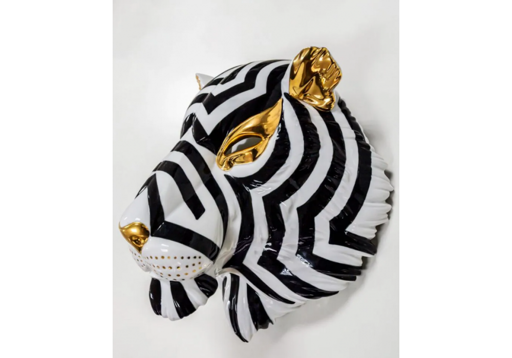 Maschera Tigre, die von José Luis Santes für Lladró geformt wurde, ist eine schwarz-weiß-goldene glänzende Porzellanskulptur, die vollständig von den Lladró-Künstlern hergestellt und handbemalt wurde.