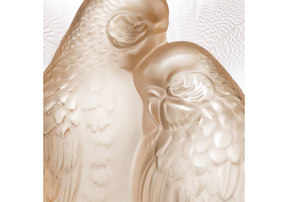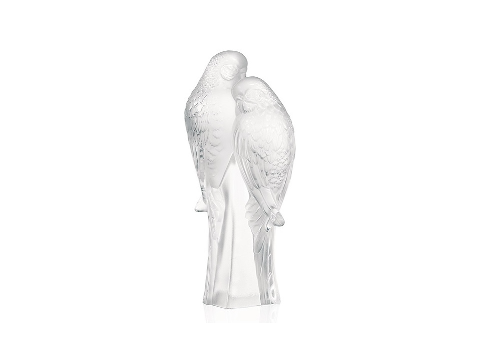 2 Parakeets signiert und hergestellt von Lalique, ist eine handgefertigte Skulptur aus Kristall. Verfügbar in zwei Ausführungen.