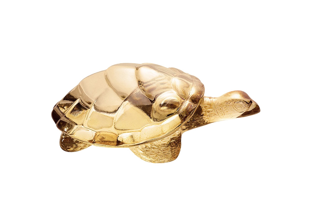 Caroline von Lalique ist eine schildkrötenförmige Skulptur, handgefertigt aus Kristall mit goldenem Glanz.