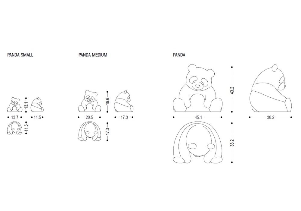 | Abmessungen | Panda_ 45.1 x 38.2 x H 43.2 cm; Panda Small_ 13.7 x 11.5 x H 13.1 cm; Panda Medium_ 20.5 x 17.3 x H 19.6 cm. |