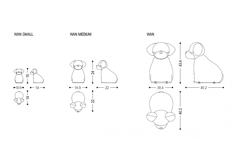 | Abmessungen | Wan_ 30.3 x 40.2 x H 43.4 cm; Wan Medium_ 16.9 x 22 x H 24 cm. Wan Small_ 10.6 x 14 x H 15 cm. |