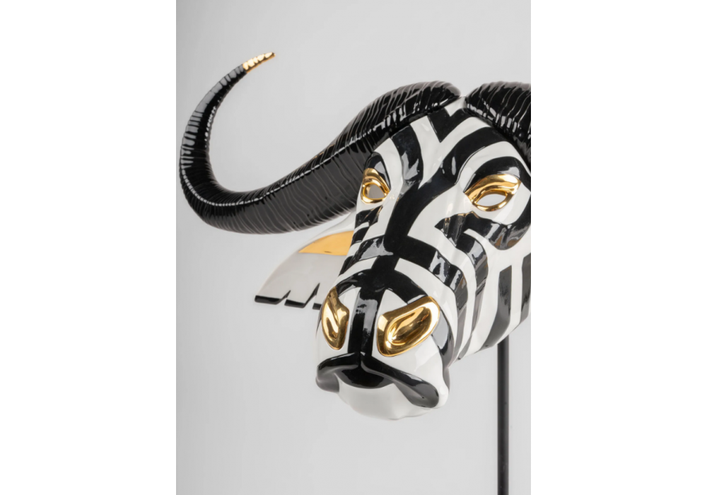 Maschera Bufalo die von José Luis Santes für Lladró geformt wurde, ist eine schwarz-weiß-goldene glänzende Porzellanskulptur, die vollständig von den Lladró-Künstlern hergestellt und handbemalt wurde.