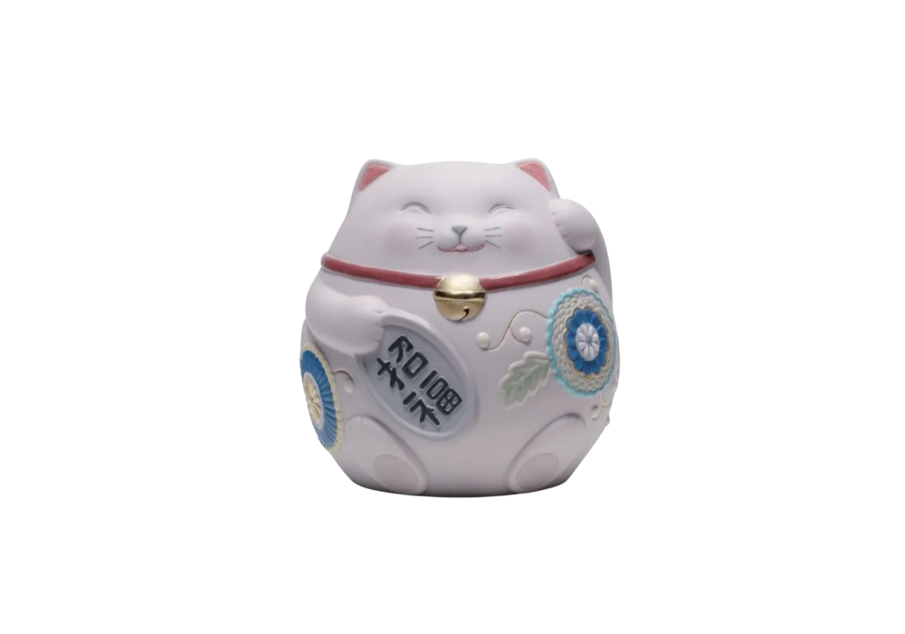 Maneki Neko III von José Javier Malavia für Lladró entworfen, ist eine Skulptur aus mattrosa Porzellan mit blauen und roten Tönen und vergoldetem Glanz mit Ornamenten und Blumendekor.