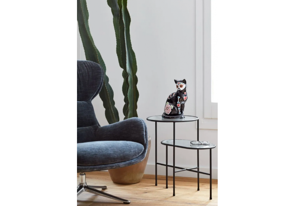 Catrina Cat von José Santaeulalia für Lladró signierte, ist eine Skulptur aus schwarz glänzendem Porzellan mit farbigen Verzierungen, die an die mexikanische Tradition erinnern.