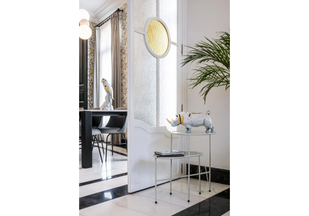 Rhino Cyborg vonErnest Massuet für Lladró entworfen, ist eine glänzende Porzellanskulptur, die vollständig von den Lladró-Künstlern hergestellt und handbemalt wurde.