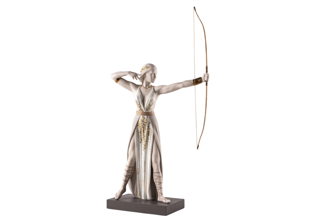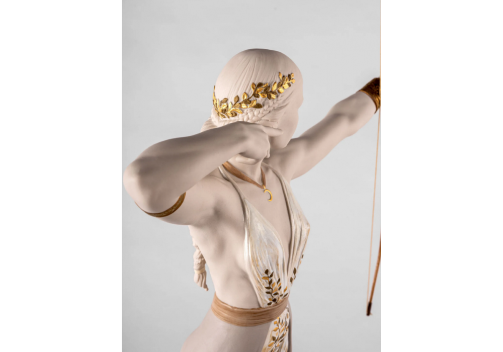 Diana von Ernest Massuet für Lladró geschaffen, ist eine Skulptur aus mattweißem Porzellan, die eine Göttin der römischen Mythologie darstellt. Die Waffen und Details sind in Ocker und Gold gehalten.