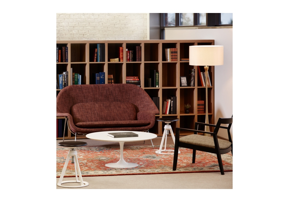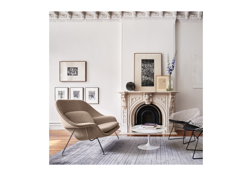 Womb designed by Eero Saarinen for Knoll is a settee with structure in steel rod, polished chrome finish or painted black. The seat can be upholstered in leather or fabric.